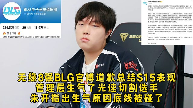 01:22无缘8强BLG官博道歉,管理层生气了删除选手ID光速切割,朱开指出生气原因底线被碰了!